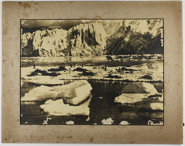 Crabeater Seals and Adelie Penguins drifting on an ice floe. Eric Douglas captioned the image 'Crabeater Seals and Adelie Penguins drifting on their frozen raft'. Photograph taken during the British Australian New Zealand Antarctic Research Expedition (BANZARE), Voyage 1.
