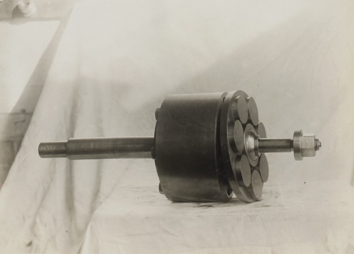 Printed in black ink on a cream label attached to album page below photograph: 'PHOTO 9. / MACHINE No. 5. / 7 x 1 7/8" x 1 1/8" Oil Pump, Cyclinder Barrel, / slipper cage and slippers.' Hand written in red ink on album page above photograph: 'Neg / 5052' Hand written in grey pencil on album page below photograph: '52'