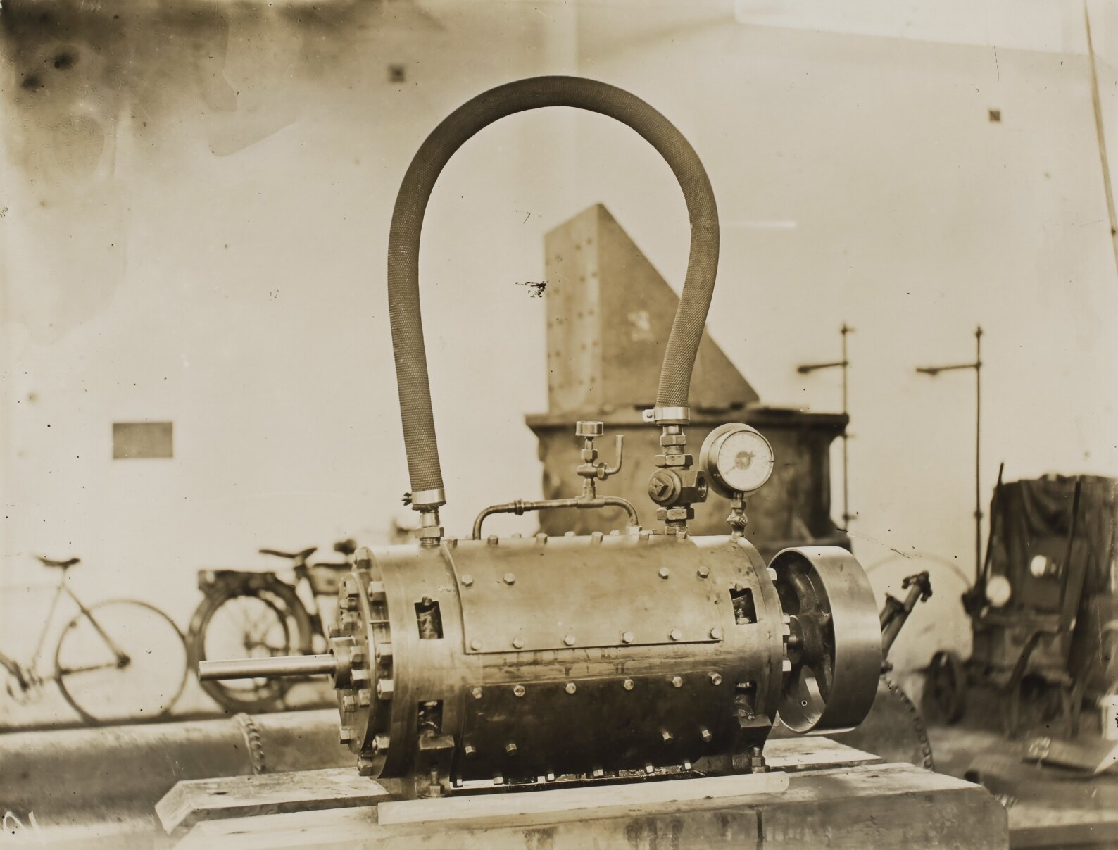Printed in black ink on a cream label attached to album page below photograph: 'PHOTO 10. / MACHINE No. 2. / 8 x 2 3/4" x 2 7/8" Air Compressor, Assembled for test.' Hand written in red ink on album page beside photograph: 'Neg / 5053' Hand written in grey pencil on album page below photograph: '53'