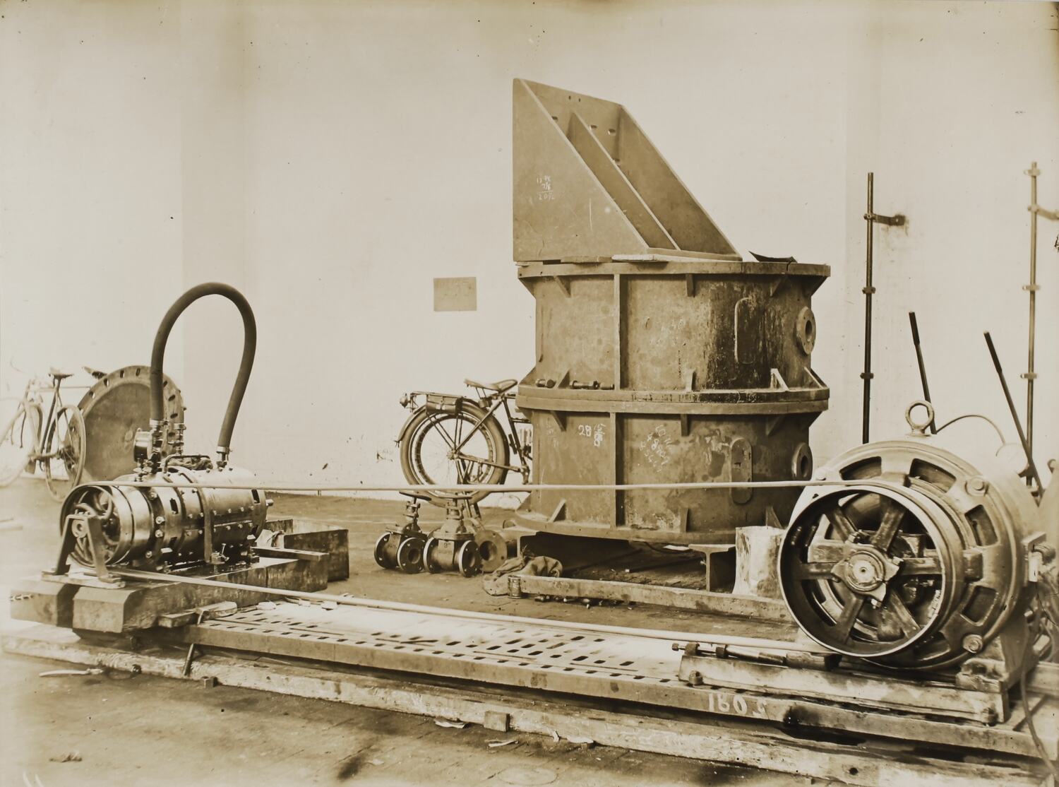 Printed in black ink on a cream label attached to album page below photograph: 'PHOTO 11. / MACHINE No. 2. / 8 x 2 3/4" x 2 7/8" Air Compressor, erected for test.' Hand written in grey pencil on album page below photograph: '54'