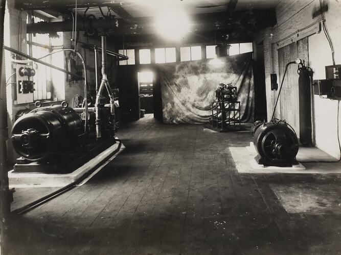 Room interior showing an eight cylinder gas engine coupled to a generator. A section of an eight cylinder petrol engine is shown on a stand in the background.
