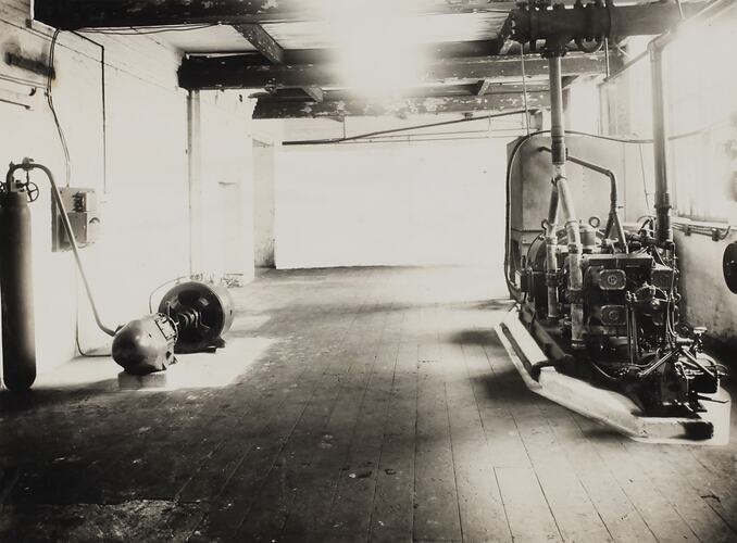 Room interior showing an eight cylinder gas engine coupled to generator.