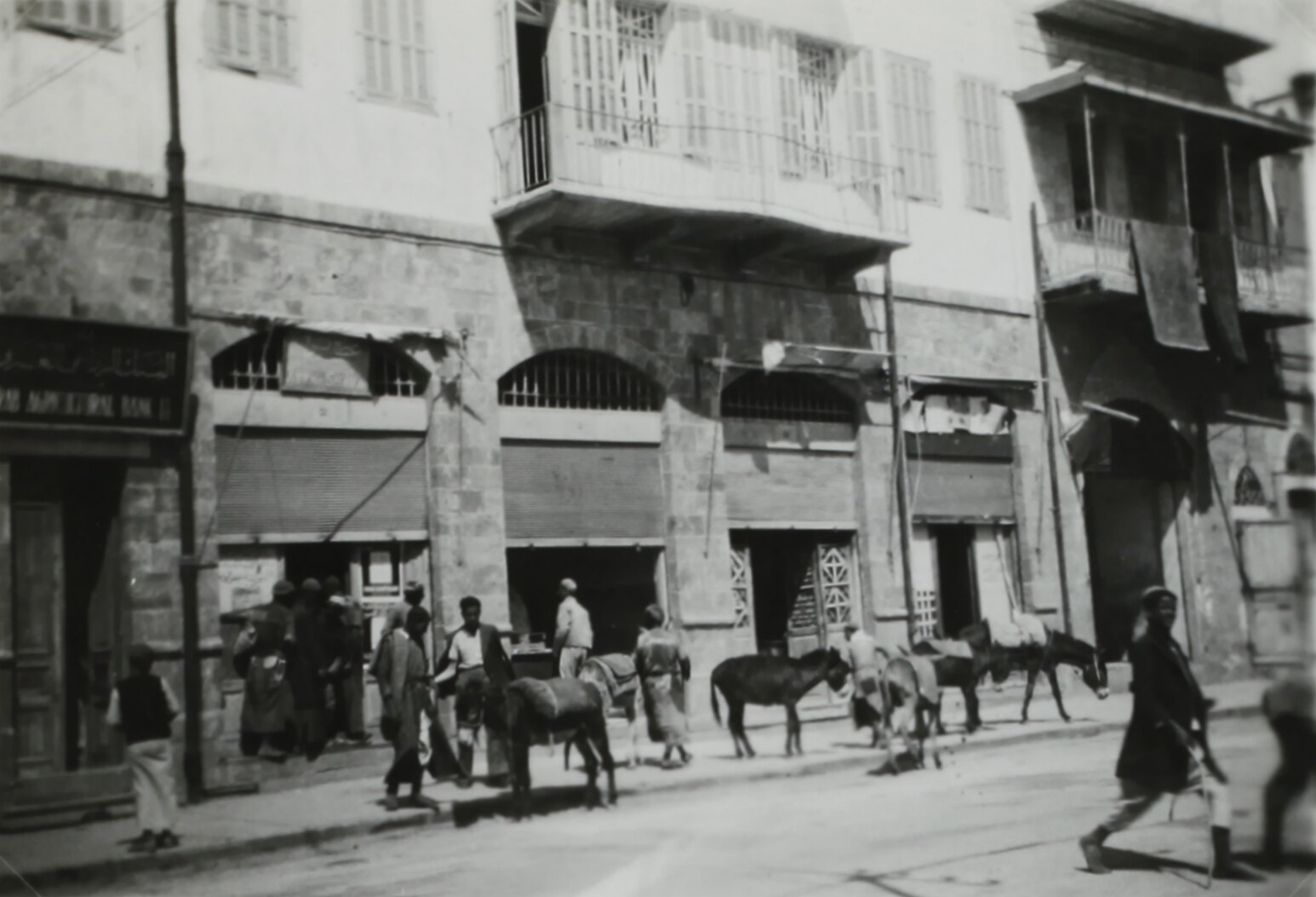 Street scene showing men and donkeys on a footpath in front of buildings.