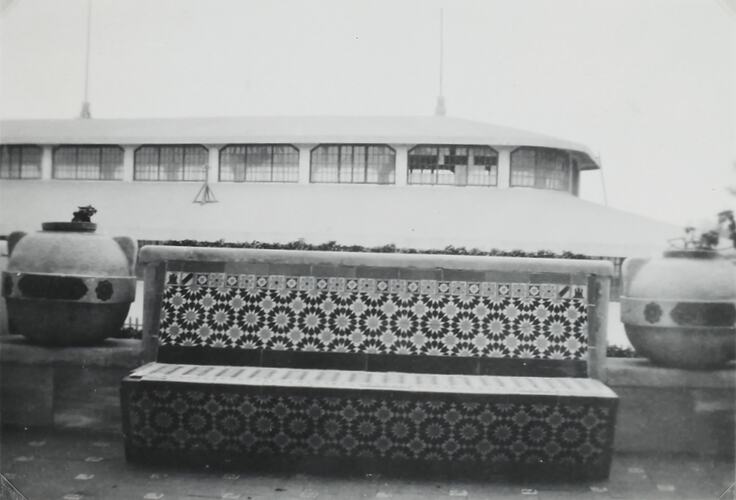 Hand written in white ink on album page below photograph: 'MOSAIC SEAT' Hand written in grey pencil on back of photograph: '24' Printed in black ink on back of photograph: 'Velox' [repeated]