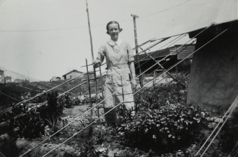 Nell Duncanson in military uniform standing in a garden next to a tent.
