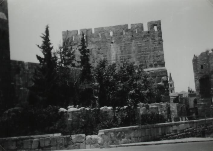 Hand written in white ink on album page below photograph: 'DAVID'S TOWER JERUSALEM' Hand written in grey pencil on back of photograph: '2' Printed in black ink on back of photograph: 'Velox' [repeated]