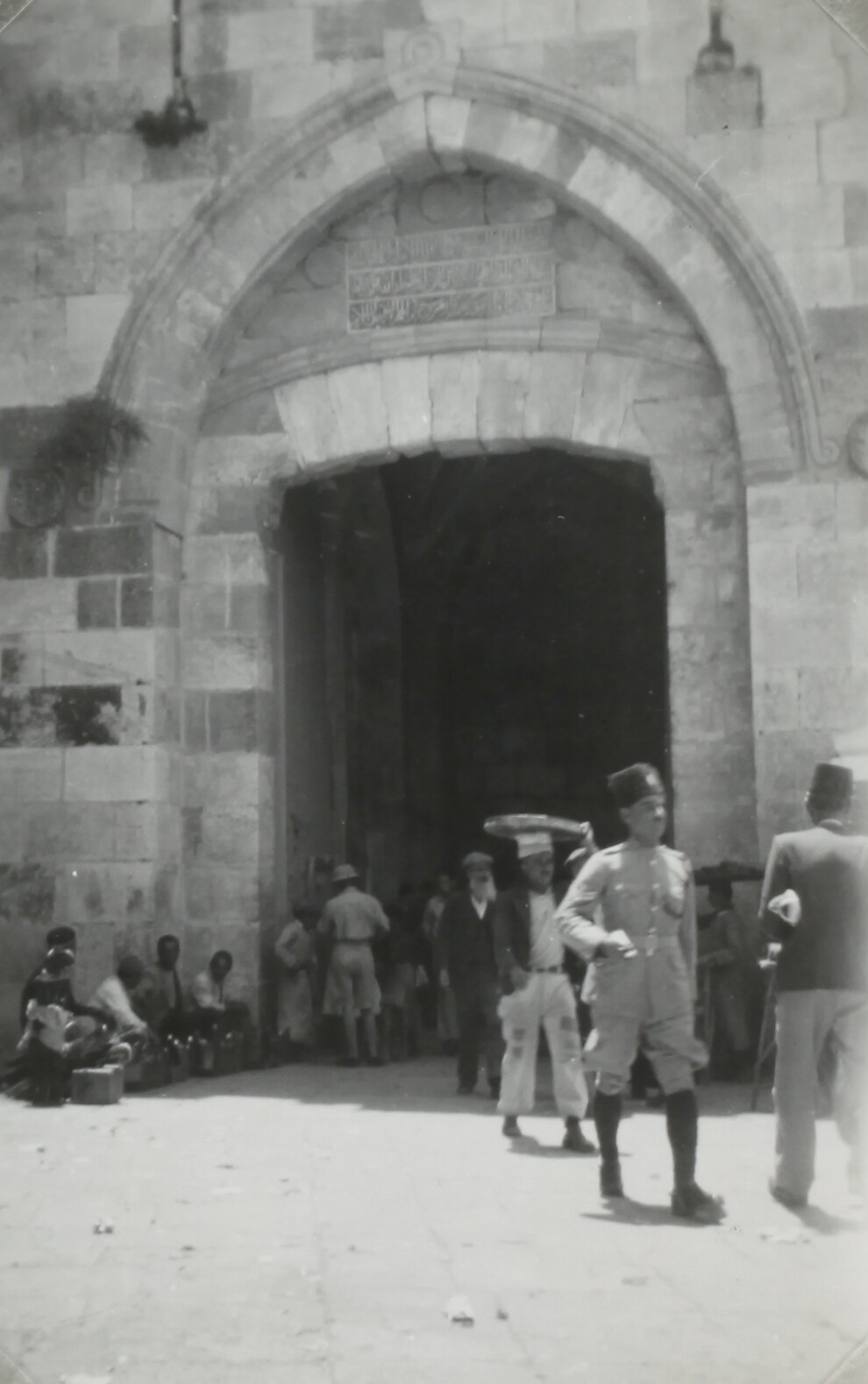 Men standing and seated at Jaffa Gate, Jerusalem.