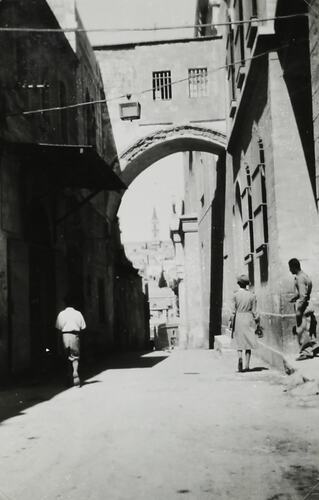 Hand written in white ink on album page below photograph: 'OLD CITY JERUSALEM' Hand written in grey pencil on back of photograph: '5' Printed in black ink on back of photograph: 'Velox' [repeated]