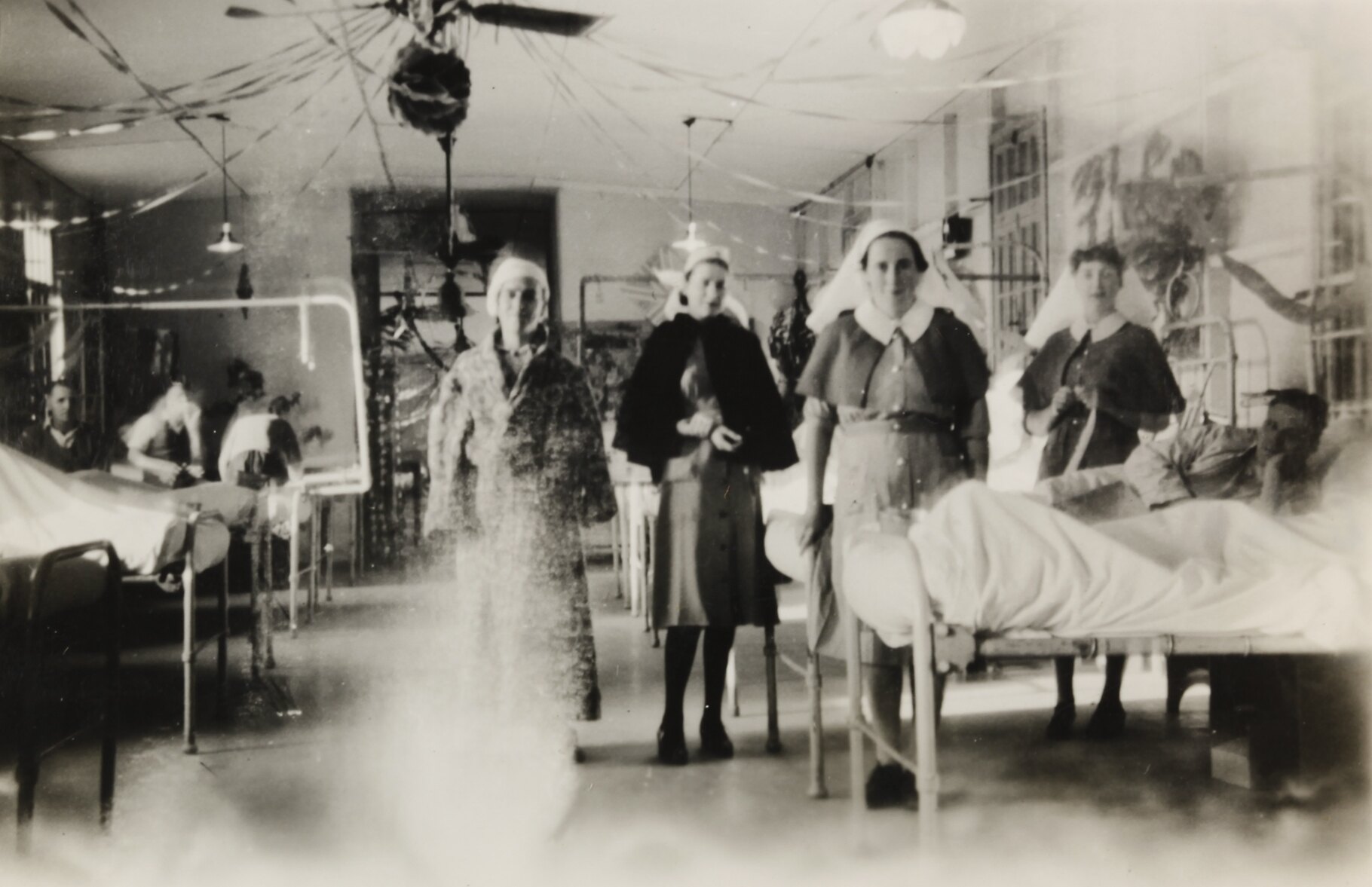 Building interior showing four women standing amongst hospital beds on Christmas Day. A man is shown lying in a bed in the foreground. Decorations are hanging from the roof.