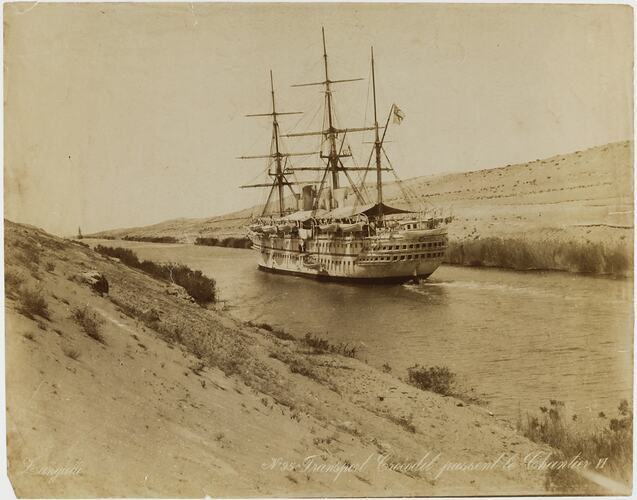 British Euphrates class troopship HMS Crocodile passing through the Suez Canal.