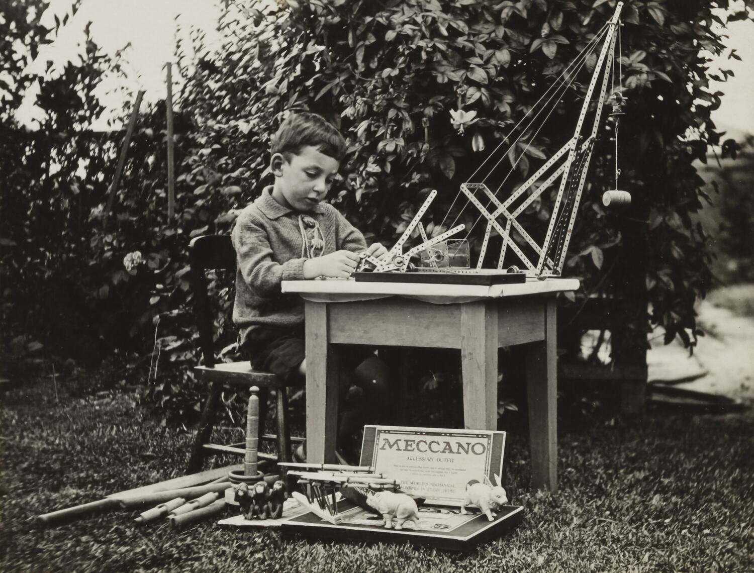 Child seated at a table in a garden surrounded by toys, including animal figurines, Meccano set, quoits and a cricket bat. The boy is playing with a Meccano model crane.