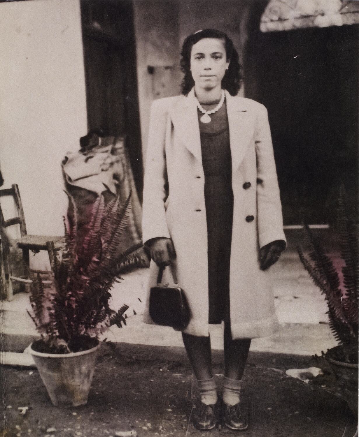 Woman wearing coat and dress and carrying a handbag posing in front of a building exterior (family home in Polis).