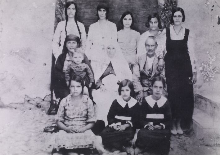 Yildiz Dervish (back row, right), born in 1925, migrated from Polis in north-west Cyprus on the 'Corsica' in December 1951 and arrived at Station Pier in Melbourne in January 1952. She had married Redjeb Eyyam by proxy (interestingly, the marriage permit indicates that Redjeb was present at the ceremony and a proxy stood in for Yildiz, suggesting that the ceremony took place in Australia). Redjeb, born in 1922, had already migrated to Melbourne in 1949 to escape the economic hardships of post World War II Cyprus. The couple had never met. His name was changed to Eyiam at the passport office in Cyprus. Neither spoke English and they were among only a small number of Turkish Cypriot migrants to come out to Australia. Redjeb found no work in his trade as a bootmaker and worked in factories, taking in boarders to help pay the mortgage in Footscray. The couple had four children and over the years sponsored other relatives to migrate to Australia. Yildiz returned to Cyprus a number of times; Redjeb never went back.