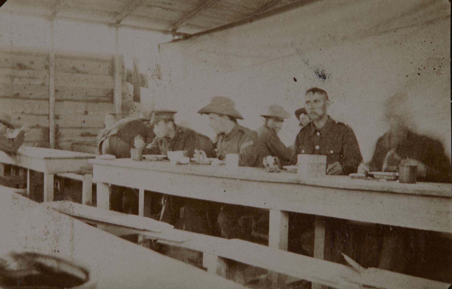 Soldiers sit eating in a mess made of wooden planks and a tin roof. The bench nearest the camera is empty except for one soldier on the far left. The head of the soldier on the far right is blurred.