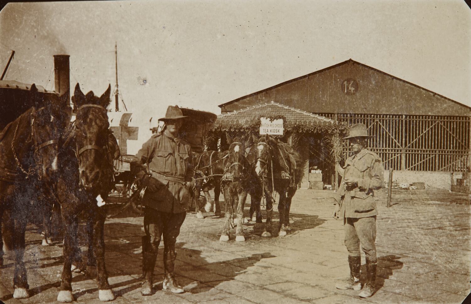 Two horse-drawn ambulances parked on a wharf; in front pose two soldiers. Behind them is a large shed with the number '14' written on the gable, in front of which is a building labelled 'British Red Cross Tea Kiosk'. In the background to the left the funnel and mast of a hospital ship.