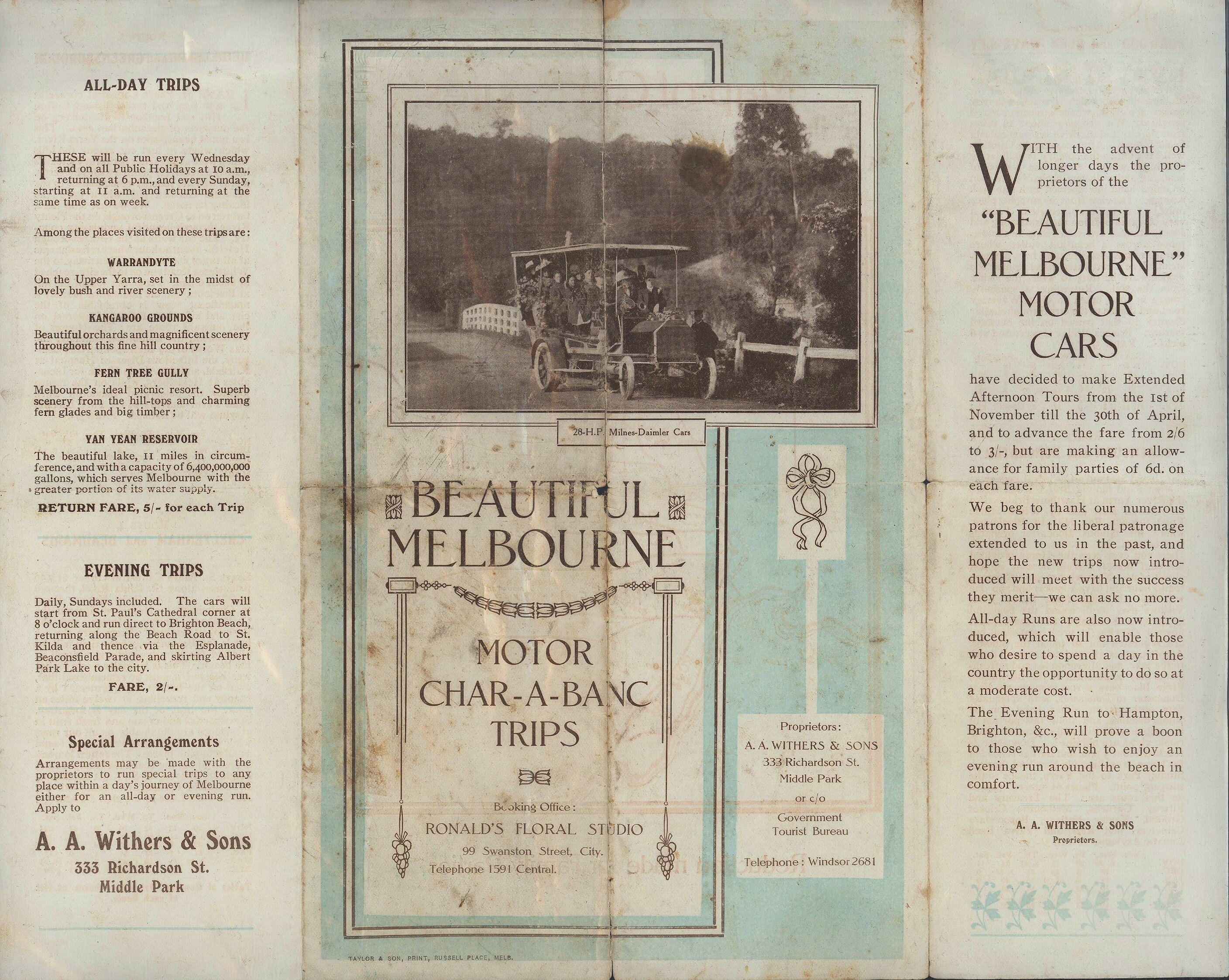 Extensive printed text. Front section headed 'BEAUTIFUL / MELBOURNE / MOTOR / CHAR-A-BANC / TRIPS / Booking Office: / RONALD'S FLORAL STUDIO / 99 Swanston Street, City. / Telephone 1591 Central. / Proprietors: A.A. WITHERS & SONS / 333 Richardson St, Middle Park / or c/o / Government / Tourist Bureau / Telephone: Windsor 2681'.