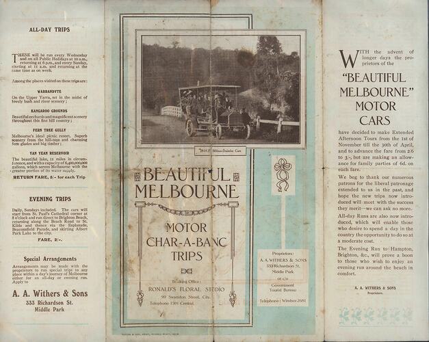 Single-page flyer featuring an image of an early bus with open sides and covered roof, crowded with well-dressed passengers. Originally folded into three. The flyer, titled 'Beautiful Melbourne, Motor Char-a-banc Trips', advertises trips by charabanc radiating out from Melbourne. The company boasts '28 HP Milnes Daimler Cars'. The tours are operated by (Albert Arthur) A.A. Withers & Sons of 333 Richardson St, Middle Park, with bookings possible through Ronald's Floral Studio of 99 Swanston Street, City. His sons were Arthur, Ted, Syd, Peter, Percy & Reg.