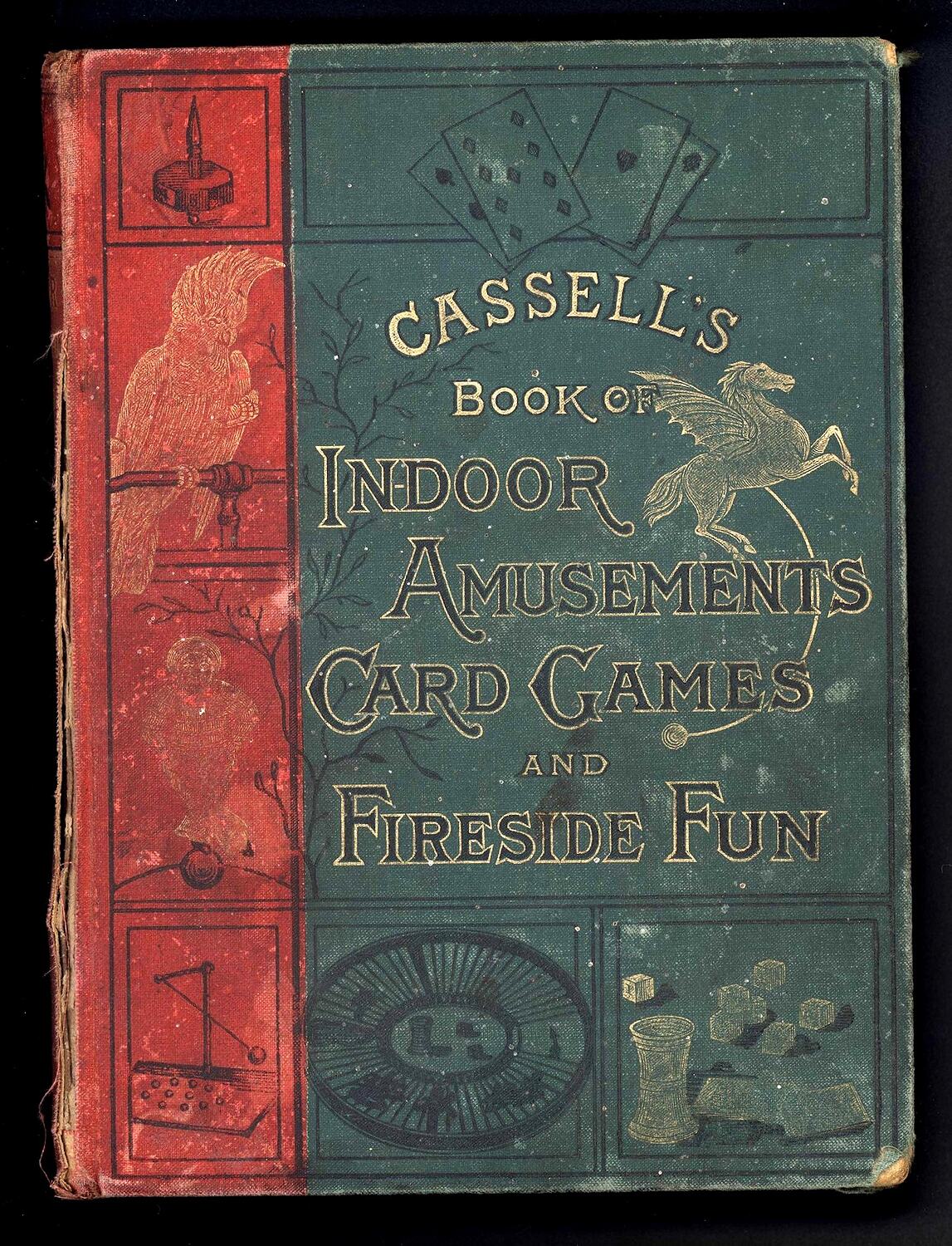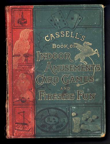 Hard covered book of 236 pages (excluding leaves inside covers, one of which is missing). Red spine with green front and back covers, embossed with gold text and images including playing cards, dice, a winged horse and a cockatoo. Edges of paper gold. Spine features a single bird on a branch, and other branches. The book begins with a Preface, then extensive Contents, followed by descriptions of each game. Some have line illustrations. Pencil marks suggest that the book has been used extensively - particularly the front half. The book ends with an index and a list of Cassell's other publications. Several words have been written in pencil on back leaf. Book broken along spine.