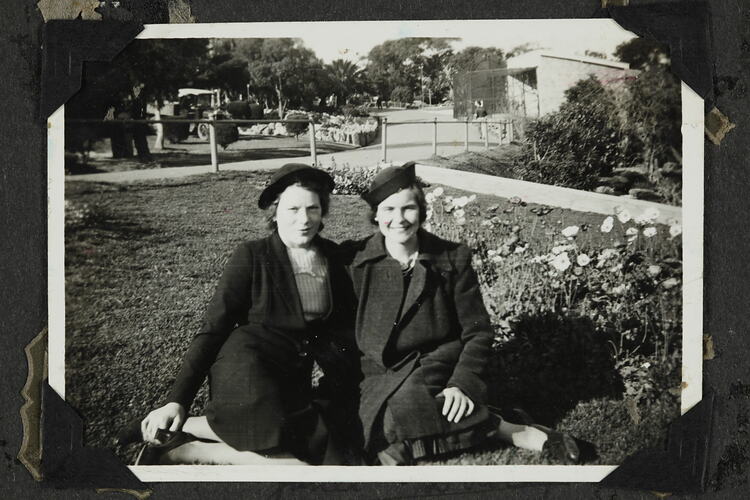 Hand written in white ink on album page; 'Janet and Dorothy / Sydney'