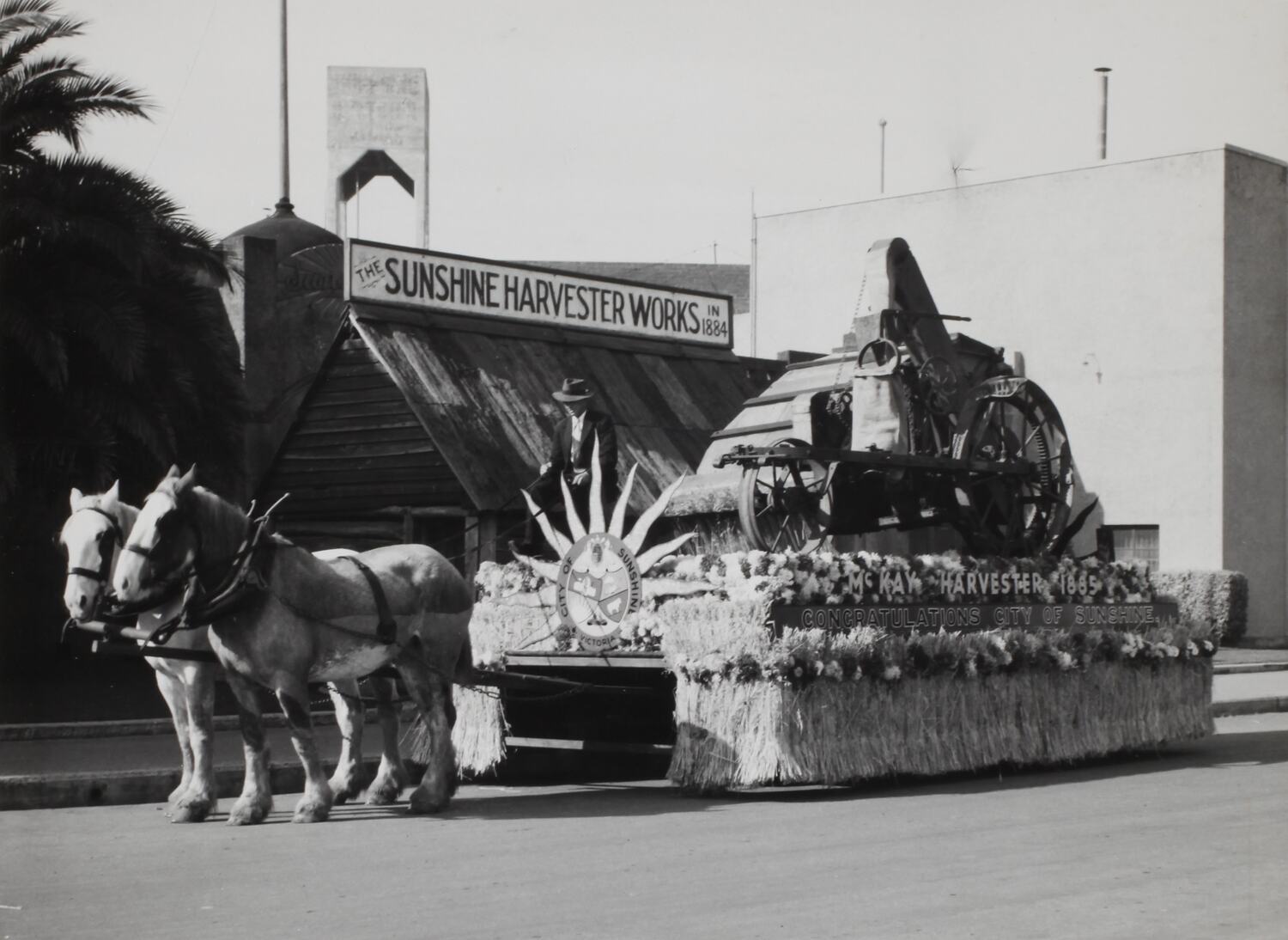 Sunshine Harvester Works' horse drawn float with machinery, in procession through streets of Sunshine during celebrations of Sunshine being made a city.