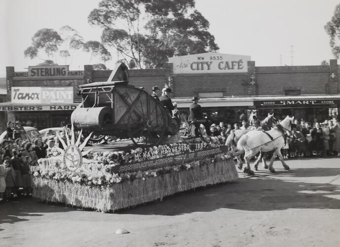 Sunshine Harvester Works' horse drawn float with machinery, in procession through streets of Sunshine during celebrations of Sunshine being made a city.