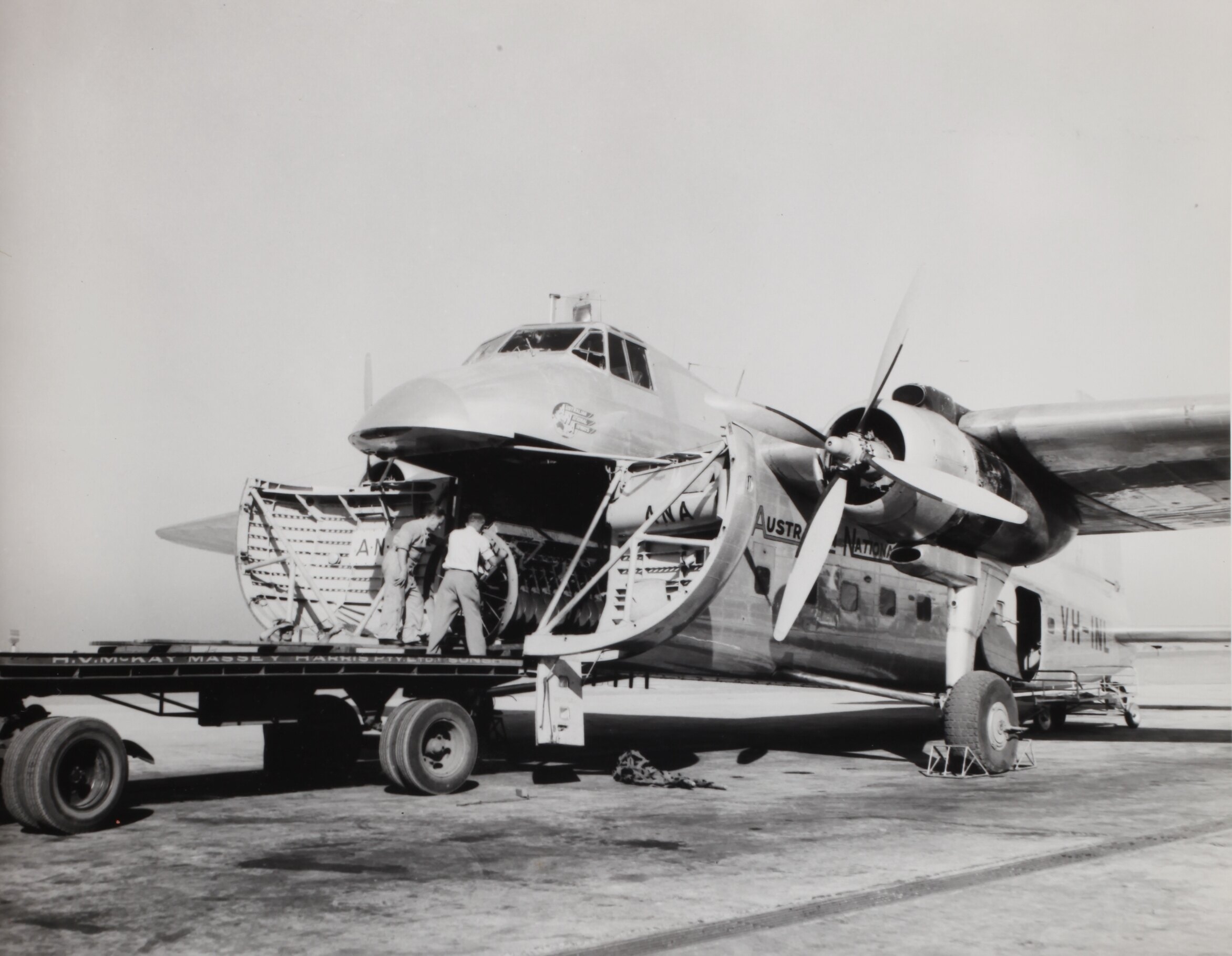 Two men loading a sun drill onto an Australian National Airways aircraft at Essendon for transportation to Tasmania.