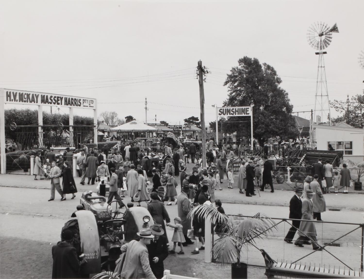 Crowds of people at the H. V. McKay Massey Harris stand at the Royal Melbourne Show.