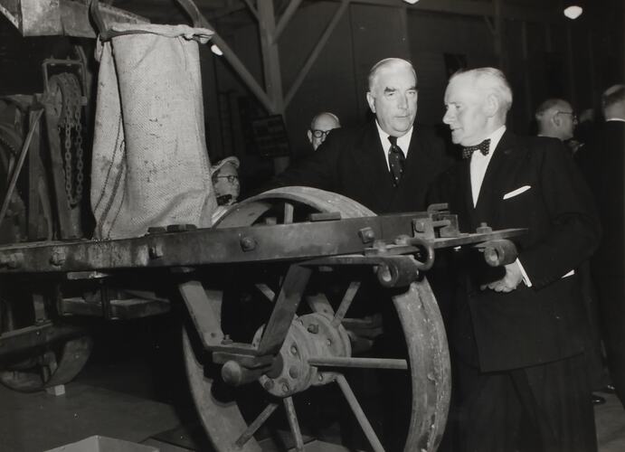 Prime Minister Sir Robert Menzies and Cecil McKay standing beside the 1885 stripper harvester at the Sunshine Historical Exhibition celebrating the 70th anniversary of the stripper harvester.