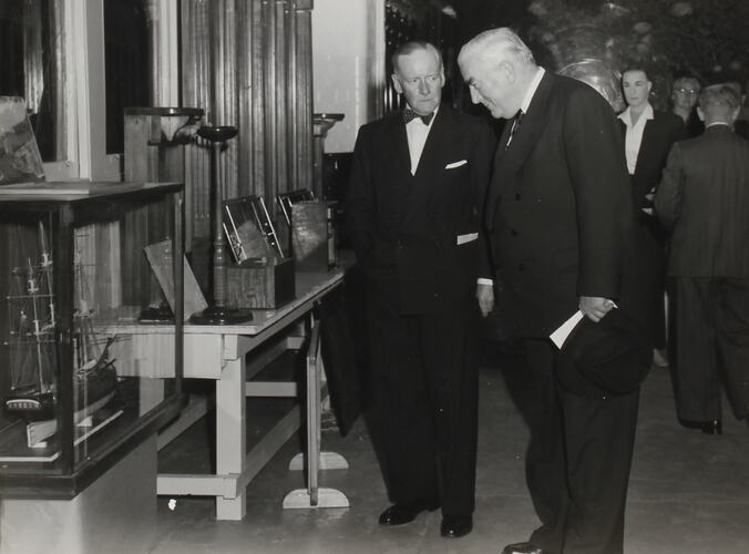 Prime Minister Sir Robert Menzies and Cecil McKay at the Sunshine Historical Exhibition celebrating the 70th anniversary of the stripper harvester.