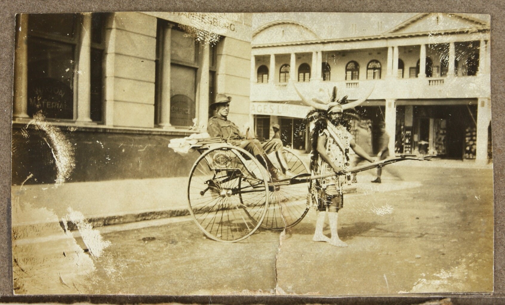 Image depicts an unidentified serviceman in a rickshaw, pulled by a man in indigenous clothing and large headdress.
