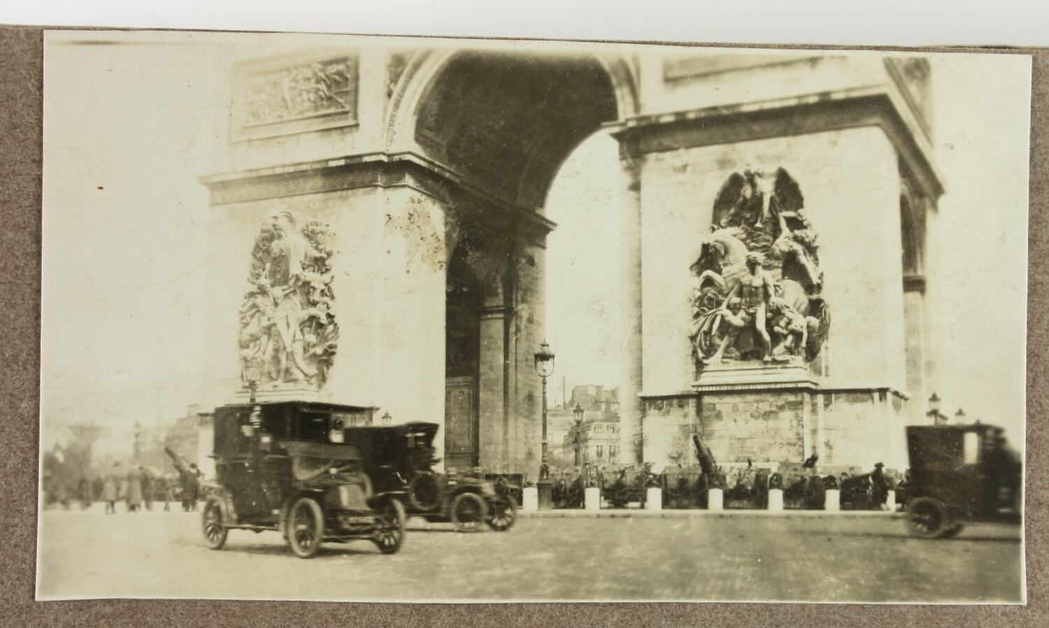 Image depicting a large, deocrated stone archway. In front, to the right of the arch there is what looks to be heavy artillery. Three automobiles are driving towards the right of frame in front of the arch, only half of the lead vehicle can be seen as the front has disappeared out of frame.