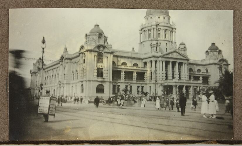 Image depicting a large, domed building situated on a street corner. There are at least two sets of tracks along the street and there are figures milling about along the pavement, including a figure to the left of frame who is wearing a four sides sandwich boad.