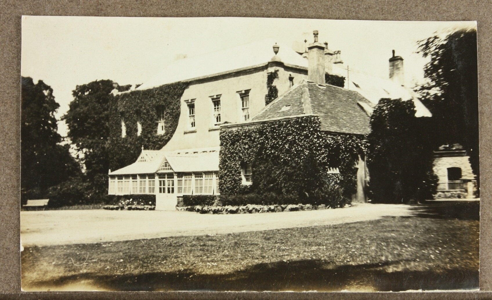 Image depicting a building that is covered in some sort of vine. A conservatory is attached to the side of the house to the side of which stands a park bench along what looks to be a curved driveway.