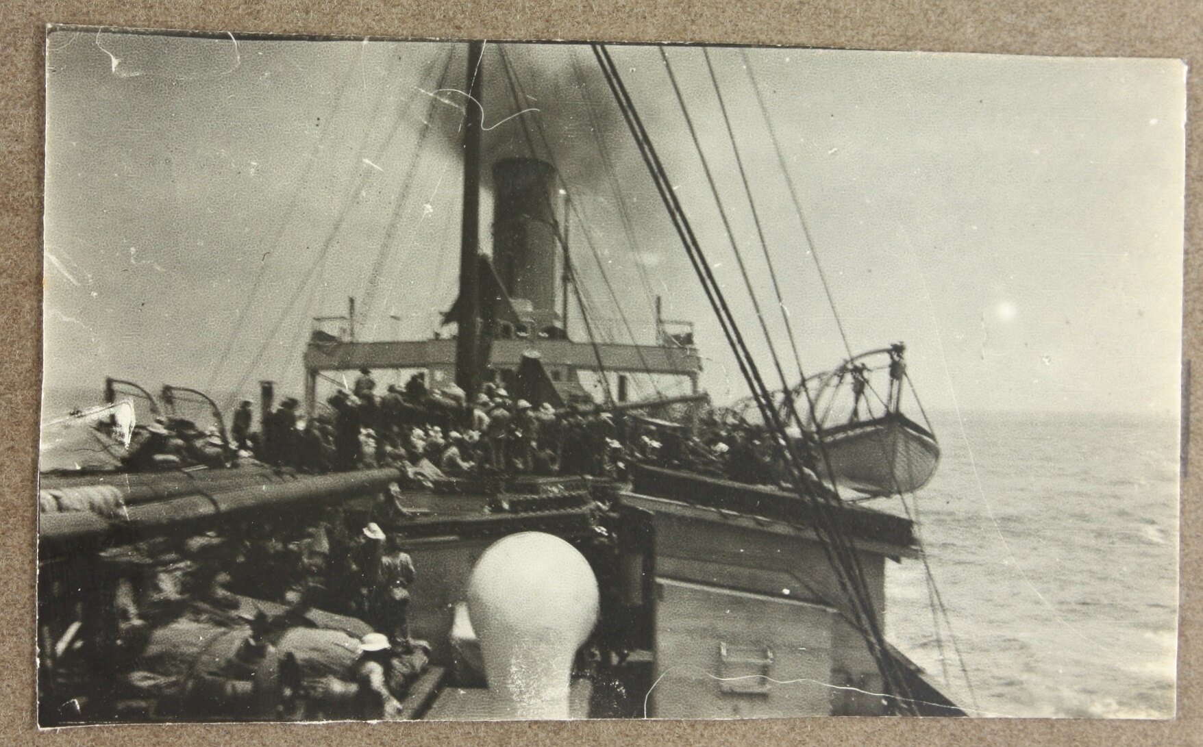 Image depicting the upper and lower deck of a ship that is full of figures crowding around, all apparently intent on something unseen on the top deck. The ship's funnel can be seen in the background and lifeboats hang off both sides of the boat.