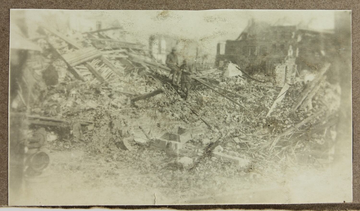 Image depicting two servicemen sitting on a large pile of rubbleof demolished buildings. As Cyril Rose spent a majority of his wartime service in France it is possible that this is the result of bombs being dropped on a French city.