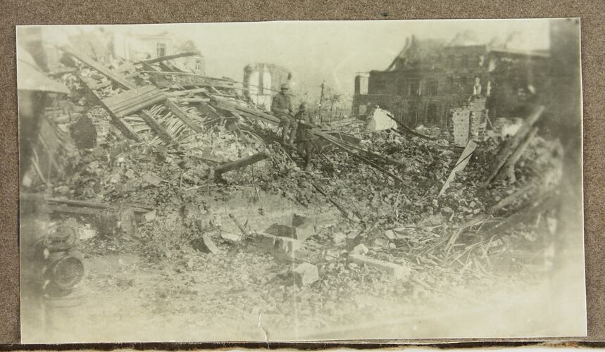 Image depicting two servicemen sitting on a large pile of rubbleof demolished buildings. As Cyril Rose spent a majority of his wartime service in France it is possible that this is the result of bombs being dropped on a French city.