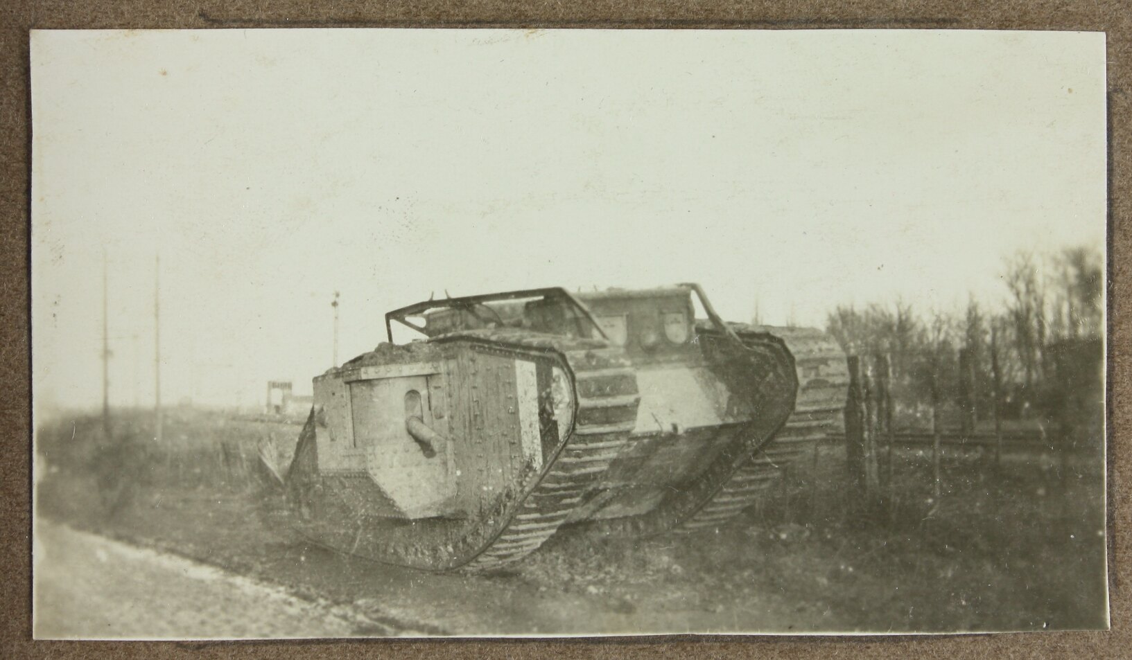 Image depicting a British Mk.V Male tank stopped at the side of a road.