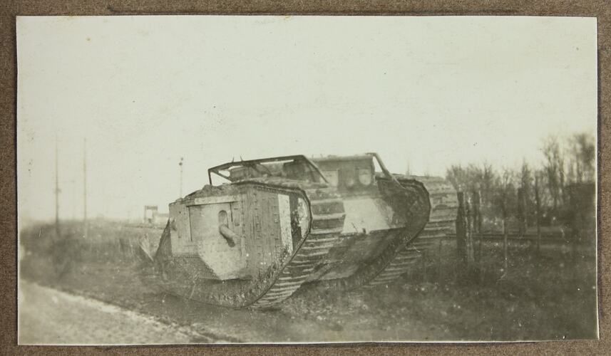 The tank depicted in this image is a Mark V, 1918 model. Mark V tanks were used at both the Battle of Hamel (July 4, 1918) and the Battle of Amiens (August 8, 1918). The specific tank depicted in this image is difficult to identify as over 400 Mark V tanks were built and were dispersed over at least eight different battalions.