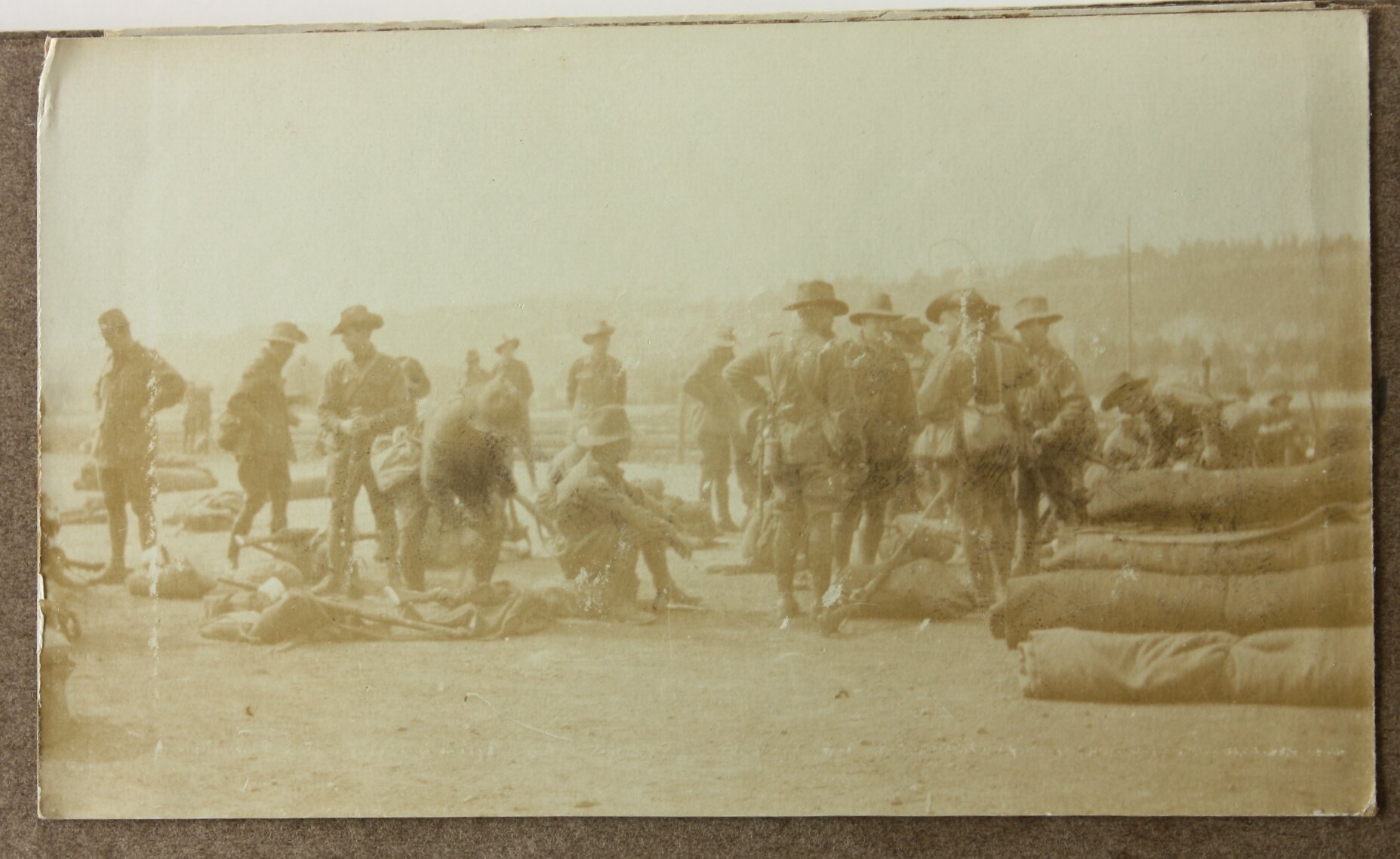 Image possibly depicts a bivouac, with soldiers and packs.