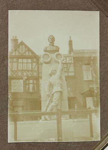 Image depicting the memorial erected in Norwich, England, to Edith Cavell, taken between October 1918 and July 1919. One of 129 World War I photographs likely to have been taken by Driver Cyril Rose, AIF. Rose was made a driver in the 1st Australian Auxiliary Mechanical Transport Company before moving to the 2nd Australian Divisional Mechanical Transport Company when in France. He sailed from Melbourne on 22 December 1916 on the Persic, arriving in England in March 1917. In June he was sent to France where his service consisted of driving in a supply column. He returned to Australia on the Persic on 13 July 1919.