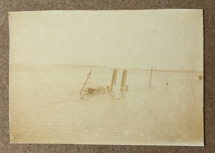 Image depicts a sunken ship close to a shoreline. The context of the image is unknown.