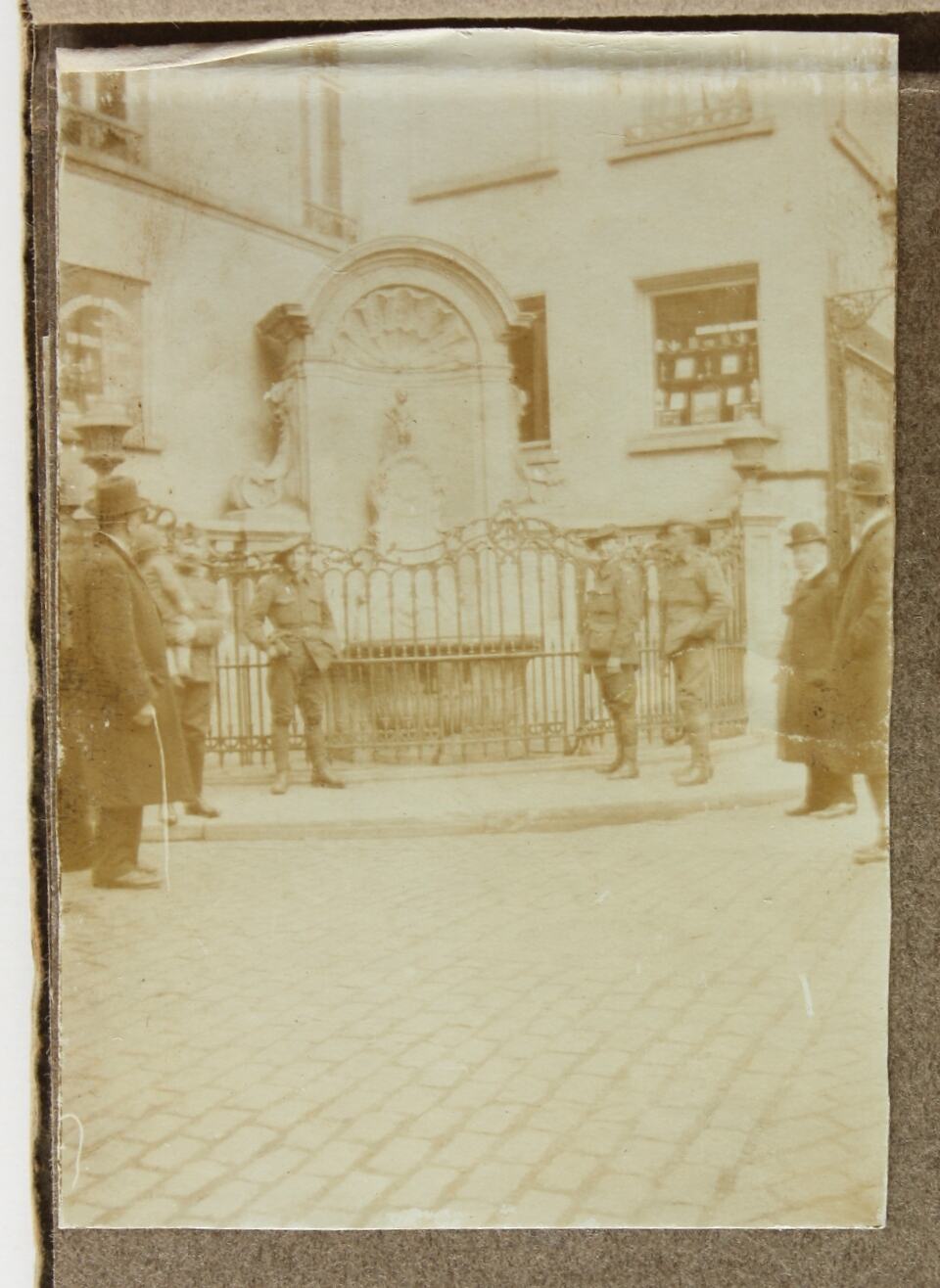 Image depicting three servicemen, and other figures, near a fountain of a small boy urinating, on what looks to be a street corner.
