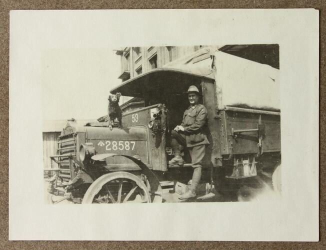 Image of an unidentified serviceman, possibly Cyril Rose himself, standing on the edge of a truck. There is an unidentified dog on the bonnet. Mascots were frequently claimed by servicemen and their units and it is possible that this dog is a mascot.