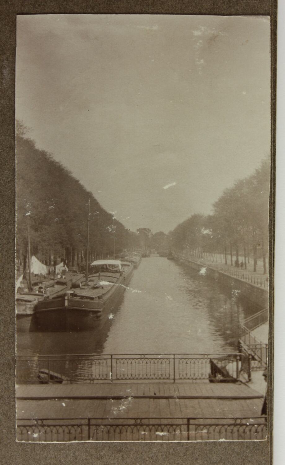 Image depicts canal boats moored along the edge of a canal. This was possibly taken along the Avon-Kennet Canal in Wiltshire, England, that was very close to where Cyril Rose is likely to have been stationed at Warminster.
