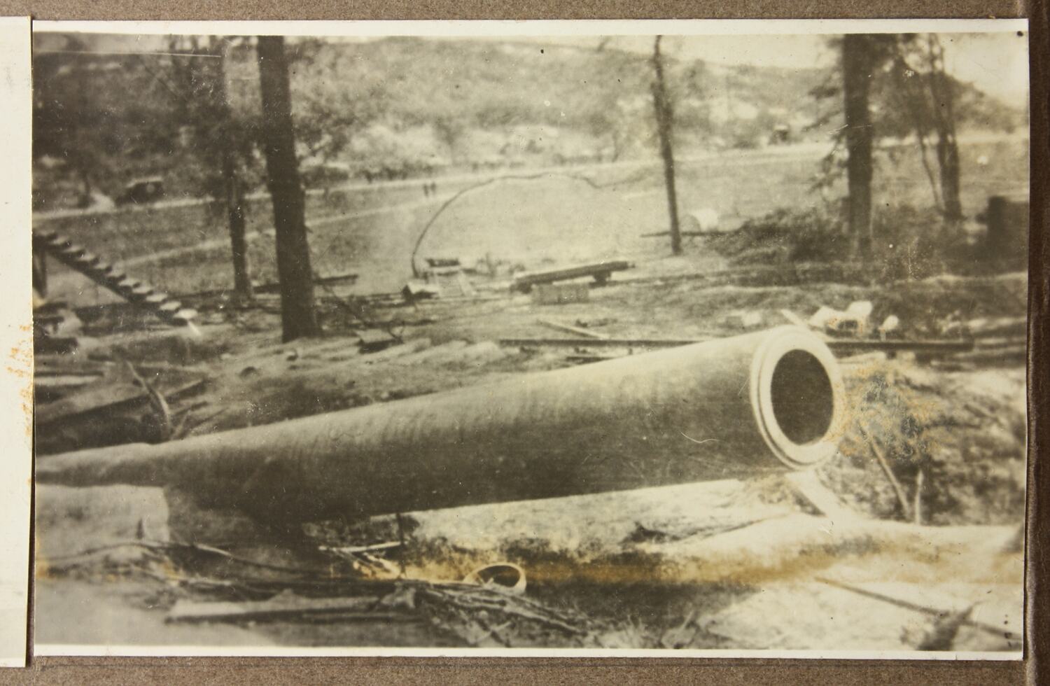 Image depicting a large piece of heavy artillery in a hole in the ground. What looks like a road can be seen in the background, along which appears to be trucks or lorries and horses.