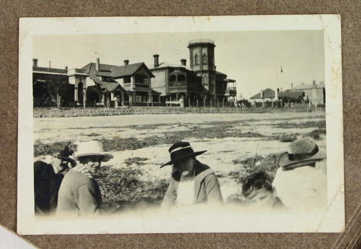 Image depicts a group of people seated in front of an unidentified complex of buildings, possibly having a picnic.