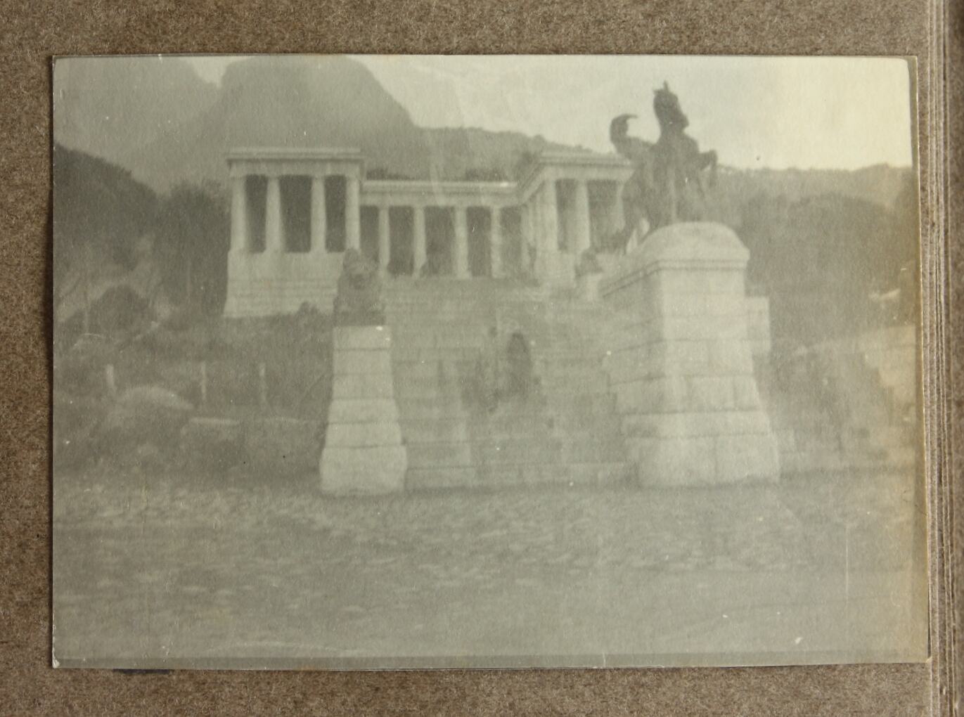 Image of the lion staircase at the Rhodes Memorial in Cape Town, South Africa. The monument was designed by Sir Francis Macey and Sir Herbert Baker and commemorates Cecil Rhodes, an English businessman the founder of De Beers who was based at Cape Town. His house was also a popular tourist attraction for servicemen during World War I.