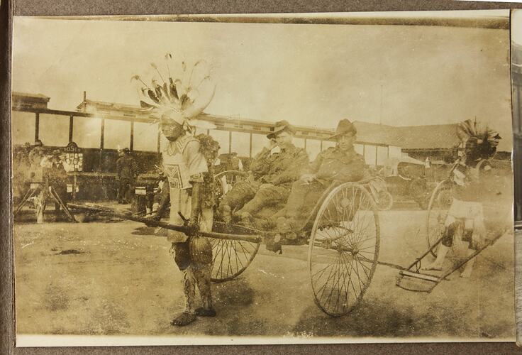 Image depicting two servicemen in a rickshaw being pulled by a man in native garb with an elaborate headdress.