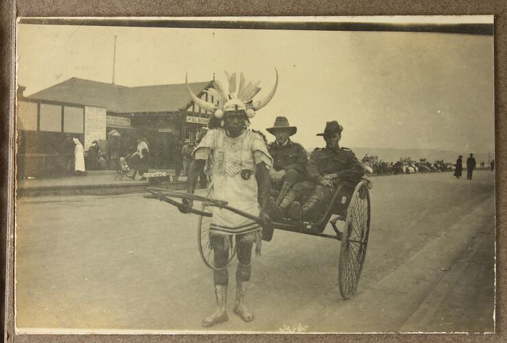 Image depicts two unidentified servicemen in a rickshaw, pulled by man wearing an elaborate headdress.