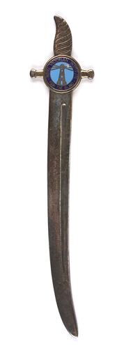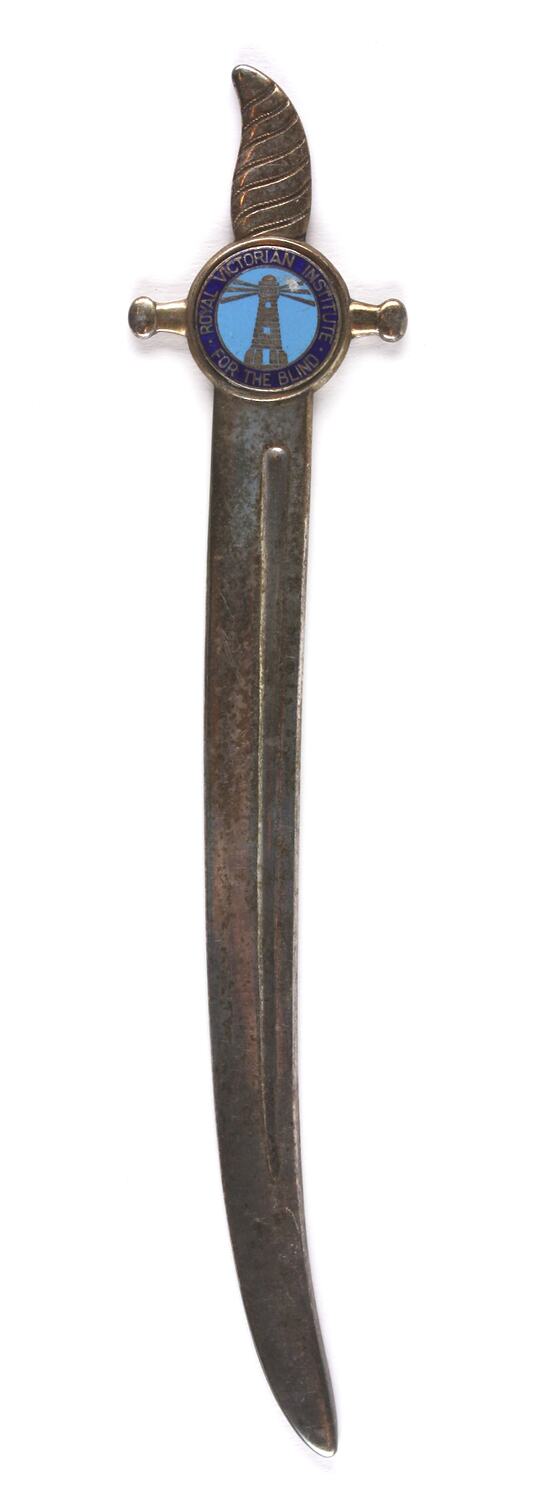 Metal letter opener, silver plated, cast in the shape of a sword. There is a badge at the top of the handle enamelled in light and dark blue depicting the Royal Victorian Institute for the Blind logo of a lighthouse. The maker's mark is stamped on the back, along with a six pointed star and boomerang motif.